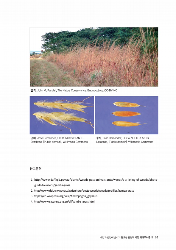 수입과 반입에 심사가 필요한 환경부 지정 위해우려종 Ⅱ 95 군락. John M. Randall, The Nature Conservancy, Bugwood.org_CC-BY-NC 열매. Jose Hernandez, USDA-NRCS PLANTS Database, [Public domain], Wikimedia Commons 종자. Jose Hernandez, USDA-NRCS PLANTS Database, [Public domain], Wikimedia Commons 참고문헌 1. http//www.daff.qld.gov.au/plants/weeds-pest-animals-ants/weeds/a-z-listing-of-weeds/photoguide-to-weeds/gamba-grass 2. http//www...