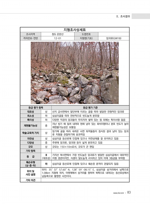 Ⅱ. 조사결과 www.nie.re.kr ? 83 지형조사상세표 조사지역 청도 운문산 도엽번호 격자번호-연번 12-01 지형명 기호 암괴류 GM18 등급 평가 항목 등급 평가 기준 대표성 상 산지 급사면에서 말단부에 이르는 골을 따라 발달한 전형적인 암괴류 희소성 하 심심이골을 따라 전반적으로 빈도높게 분포함 특이성 하 다양한 직경의 암괴들이 무리지어 쌓여 있는 점 외에는 특이사항 없음 재현불가능성 중 지난 빙기 때 밀려 내려와 현재 남아 있는 화석지형이나 분포 빈도가 높아 재현불가능성은 보통임 학술?교육적 가치 상 빙기때 골을 따라 내려온 사면 퇴적물층이 침식된 결과 남아 있는 암괴 류 지형을 관찰하기에 효과적임 자연성 상 심심이골 등산로에 인접해 있으나 자연상태를 잘 유지하고 있음 다양성 중 주변에 암괴류...