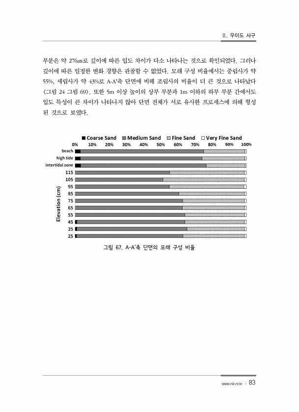 Ⅱ. 우이도 사구 www.nie.re.kr ? 83 부분은 약 276㎛로 깊이에 따른 입도 차이가 다소 나타나는 것으로 확인되었다. 그러나 깊이에 따른 일정한 변화 경향은 관찰할 수 없었다. 모래 구성 비율에서는 중립사가 약 55%, 세립사가 약 43%로 A-A축 단면에 비해 조립사의 비율이 더 큰 것으로 나타났다 그림 24 그림 69 또한 5m 이상 높이의 상부 부분과 1m 이하의 하부 부분 간에서도 입도 특성이 큰 차이가 나타나지 않아 단면 전체가 서로 유사한 프로세스에 의해 형성 된 것으로 보였다. 그림 67. A-A’축 단면의 모래 구성비율