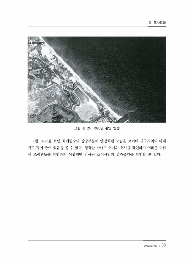 Ⅱ. 조사결과 www.nie.re.kr ? 83 그림 Ⅱ-24. 1995년 촬영 영상 그림 Ⅱ-25를 보면 회매립장의 상당부분이 안정화된 모습을 보이며 사구지역의 나대 지도 많이 줄어 있음을 볼 수 있다. 정확한 소나무 식재의 역사를 확인하기 어려운 까닭 에 조림연도를 확인하기 어렵지만 방사림 조성사업의 결과물임을 확인할 수있다.