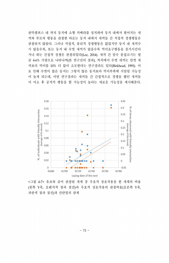 73 관악캠퍼스 내 까치 둥지에 소형 카메라를 설치하여 둥지 내에서 벌어지는 새 끼와 부모의 행동을 관찰한 바로는 둥지 내에서 새끼들 간 직접적 경쟁행동은 관찰되지 않았다. 그러나 직접적, 물리적 경쟁행동은 없었지만 둥지 내 새끼수 가 많을수록, 또는 둥지 내 수컷 새끼가 많을수록 먹이요구행동을 증가시킨다 거나 하는 간접적 경쟁은 관찰되었다 Lee, 2014 새끼 간 암수 몸집크기는 평 균 4-6% 가량으로 나타나며 본 연구진의 결과 , 까치에서 수컷 새끼는 암컷 새 끼보다 먹이를 10% 더 많이 소모한다는 연구결과도 있다 Birkhead, 1991 이 로 인해 수컷이 많은 둥지는 그렇지 않은 둥지보다 먹이부족에 시달릴 가능성 이 높게 되는데, 이번 연구결과는 새끼들 간 간접적으로 경쟁을 했던 새끼들 이 이...