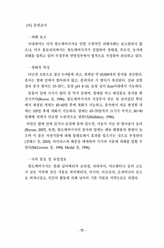 75 다 문헌조사 ?피해 보고 국내에서는 아직 왕도깨비가지로 인한 구체적인 피해사례는 보고된바가 없 으나, 미국 플로리다에서는 왕도깨비가지가 침입하여 생태계, 목초지, 농지에 피해를 입히고 있어 주정부와 연방정부에서 법적으로 지정하여 관리하고 있다. ?생태적 특성 다년생 초본으로 꽃은 59월에 피고, 개체당 약 45,000개의 종자를 생산한다. 종자는 열매 안에서 발아하지 않고, 종피처리 시 발아가 촉진된다. 실내 실험 결과 종자 발아는 1535℃, 토양 pH 410, 토양 깊이 8cm이내에서 가능하다. 동물이 잎에 가시가 많아 잘 먹지 못하며, 열매를 먹고 배설물로 종자를 확 산시키다 Brown 등, 1996 왕도깨비가지의 지상부가 죽은 뒤 남아있던 뿌리 에서 재생된 개체는 4560일 후에 개화가 가능하고...