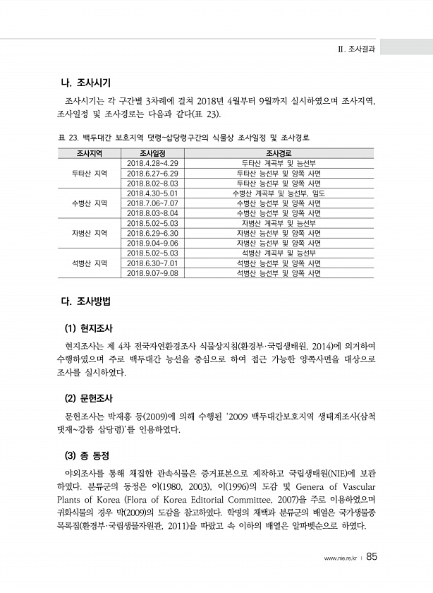 Ⅱ. 조사결과 www.nie.re.kr ? 85 나. 조사시기 조사시기는 각 구간별 3차례에 걸쳐 2018년 4월부터 9월까지 실시하였으며 조사지역, 조사일정 및 조사경로는 다음과 같다 표 23 조사지역 조사일정 조사경로 두타산 지역 2018.4.284.29 두타산 계곡부 및 능선부 2018.6.276.29 두타산 능선부 및 양쪽 사면 2018.8.028.03 두타산 능선부 및 양쪽 사면 수병산 지역 2018.4.305.01 수병산 계곡부 및 능선부, 임도 2018.7.067.07 수병산 능선부 및 양쪽 사면 2018.8.038.04 수병산 능선부 및 양쪽 사면 자병산 지역 2018.5.025.03 자병산 계곡부 및 능선부 2018.6.296.30 자병산 능선부 및 양쪽 사면 2018.9.049.06 자병산...