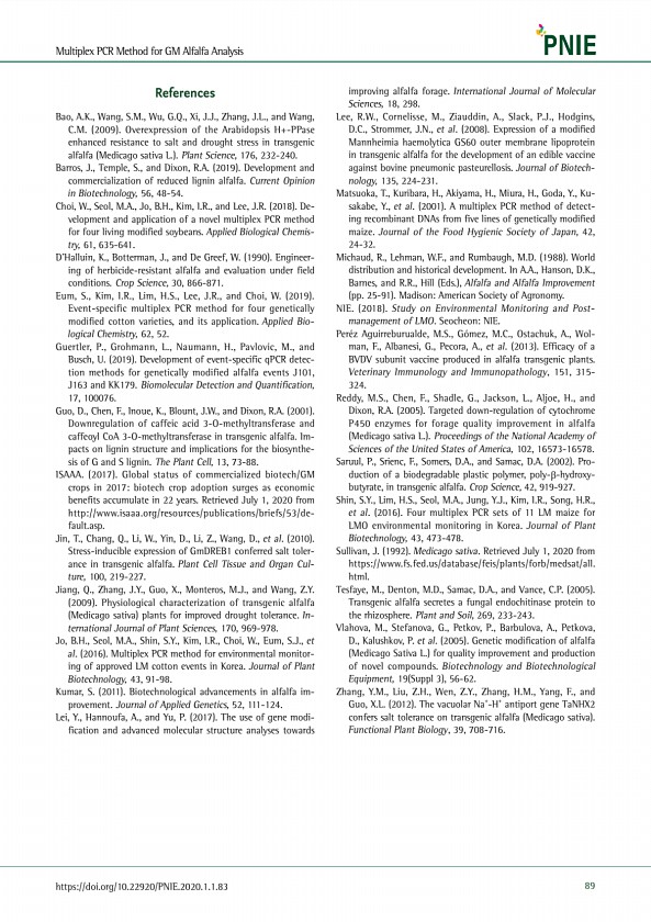 Multiplex PCR Method for GM Alfalfa Analysis https//doi.org/10.22920/PNIE.2020.1.1.83 89 References Bao, A.K., Wang, S.M., Wu, G.Q., Xi, J.J., Zhang, J.L., and Wang, C.M. 2009 Overexpression of the Arabidopsis H+-PPase enhanced resistance to salt and drought stress in transgenic alfalfa Medicago sativa L. Plant Science, 176, 232-240. Barros, J., Temple, S., and Dixon, R.A. 2019 Development and com...