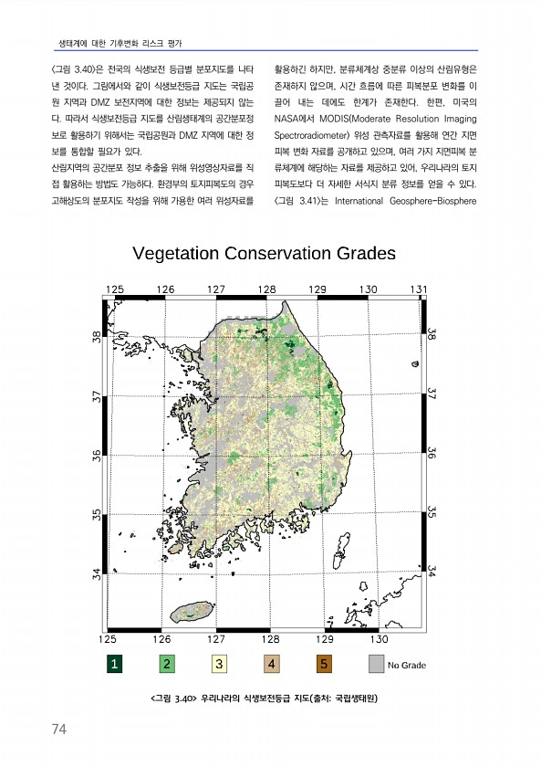 생태계에 대한 기후변화 리스크 평가 74 그림 3.40 은 전국의 식생보전 등급별 분포지도를 나타 낸 것이다. 그림에서와 같이 식생보전등급 지도는 국립공 원 지역과 DMZ 보전지역에 대한 정보는 제공되지 않는 다. 따라서 식생보전등급 지도를 산림생태계의 공간분포정 보로 활용하기 위해서는 국립공원과 DMZ 지역에 대한 정 보를 통합할 필요가 있다. 산림지역의 공간분포 정보 추출을 위해 위성영상자료를 직 접 활용하는 방법도 가능하다. 환경부의 토지피복도의 경우 고해상도의 분포지도 작성을 위해 가용한 여러 위성자료를 활용하긴 하지만, 분류체계상 중분류 이상의 산림유형은 존재하지 않으며, 시간 흐름에 따른 피복분포 변화를 이 끌어 내는 데에도 한계가 존재한다. 한편, 미국의 NASA에서 MODIS Moderate ...