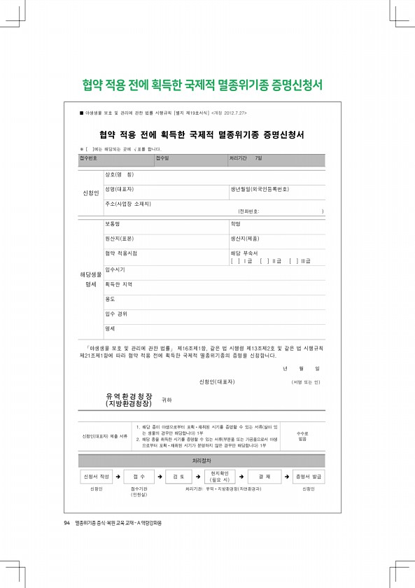 94 멸종위기종 증식·복원 교육 교재 A 역량강화용 협약 적용 전에 획득한 국제적 멸종위기종증명신청서