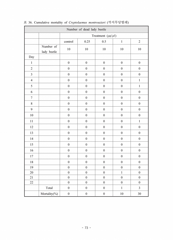 73 36. Cumulative mortality of Cryptolaemus montrouzieri Number of dead lady beetle Treatment ㎍/㎕ control 0.25 0.5 1 2 Number of lady beetle 10 10 10 10 10 Day 1 0 0 0 0 0 2 0 0 0 0 0 3 0 0 0 0 0 4 0 0 0 0 1 5 0 0 0 0 1 6 0 0 0 0 0 7 0 0 0 0 0 8 0 0 0 0 0 9 0 0 0 0 0 10 0 0 0 0 0 11 0 0 0 0 1 12 0 0 0 0 0 13 0 0 0 0 0 14 0 0 0 0 0 15 0 0 0 0 0 16 0 0 0 0 0 17 0 0 0 0 0 18 0 0 0 0 0 19 0 0 0 0 0 20...
