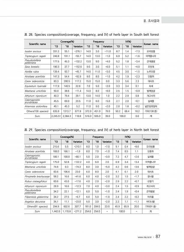 Ⅱ. 조사결과 www.nie.re.kr ? 87 Scientific name Coverage % Frequency IV % Korean name ‘13 ‘18 Variation ‘13 ‘18 Variation ‘13 ‘18 Variation Isodon excisus 331.2 55.1 -276.1 14.0 3.0 -11.0 8.7 1.4 -7.3 오리방풀 Tripterygium regelii 246.8 191.1 -55.7 14.0 13.0 -1.0 6.9 5.2 -1.6 미역줄나무 Pseudostellaria palibiniana 177.5 45.3 -132.2 13.0 9.0 -4.0 5.2 1.8 -3.4 큰개별꽃 Sasa borealis 190.3 37.7 -152.6 9.0 3.0 -6.0 5.1...
