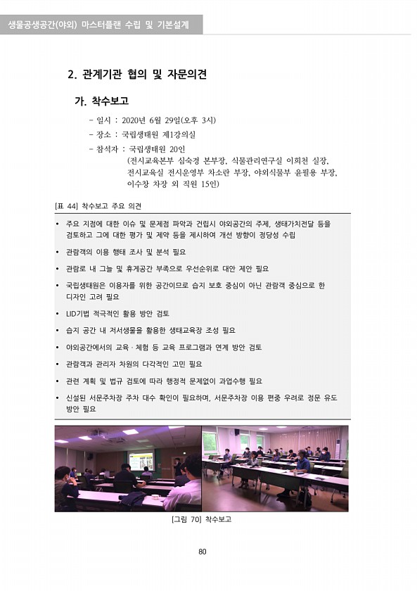 생물공생공간 야외 마스터플랜 수립 및 기본설계 80 2. 관계기관 협의 및 자문의견 가. 착수보고 일시 2020년 6월 29일 오후 3시 장소 국립생태원 제1강의실 참석자 국립생태원 20인 전시교육본부 심숙경 본부장, 식물관리연구실 이희천 실장, 전시교육실 전시운영부 차소란 부장, 야외식물부 윤필용 부장, 이수창 차장 외 직원 15인 ? 주요 지점에 대한 이슈 및 문제점 파악과 건립시 야외공간의 주제, 생태가치전달 등을 검토하고 그에 대한 평가 및 제약 등을 제시하여 개선 방향이 정당성 수립 ? 관람객의 이용 행태 조사 및 분석 필요 ? 관람로 내 그늘 및 휴게공간 부족으로 우선순위로 대안 제안 필요 ? 국립생태원은 이용자를 위한 공간이므로 습지 보호 중심이 아닌 관람객 중심으로 한 디자인 고려 필요 ? L...