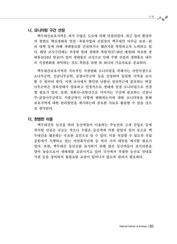 식 생 National Institute of EcologyⅠ83 나. 모니터링 구간 선정 백두대간보호지역은 과거 수많은 도로에 의해 단절되었다. 최근 들어 환경부 의 한반도 핵심생태축 연결·복원사업과 산림청의 백두대간 마루금 보전·관 리 대책 등에 의해 생태통로를 건설하거나 훼손지를 복원하고자 노력하고 있 다. 해당 조사구간에는 추풍령 일대 생태축 복원지 1718년 예정 와 비조령 생 태통로 14년 완공 가 있어 생태통로 조성으로 인해 주변 산림과 생태통로 내부 의 식생변화를 파악하는 것도 복원을 위한 또 하나의 기초자료로 중요하다. 백두대간보호지역의 지속적인 식생변화 모니터링을 위해서는 자연식생으로 소나무군락, 신갈나무군락, 굴참나무군락 등을 선정하여 동일한 지역을 조사 할 수 있어야 한다. 이번 조사에...