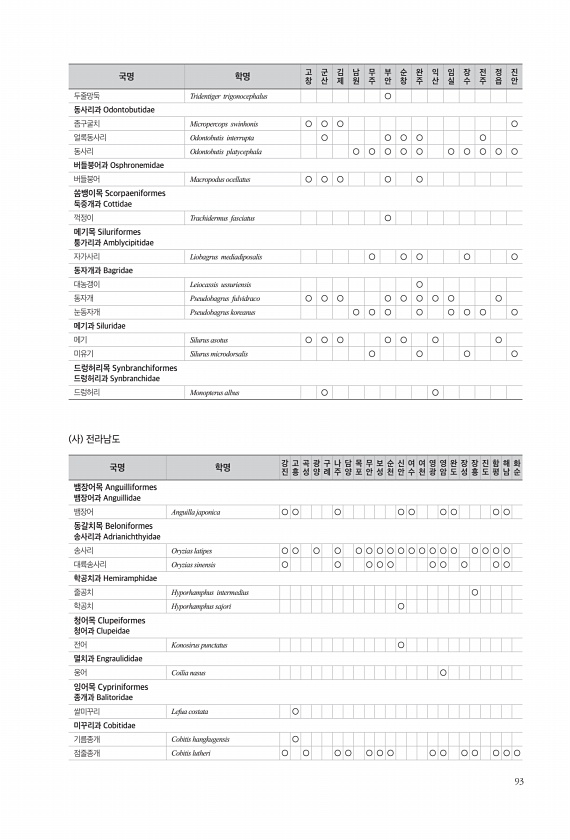 93 두줄망둑 Tridentiger trigonocephalus ○ 동사리과 Odontobutidae 좀구굴치 Micropercops swinhonis ○ ○ ○ ○ 얼록동사리 Odontobutis interrupta ○ ○ ○ ○ ○ 동사리 Odontobutis platycephala ○ ○ ○ ○ ○ ○ ○ ○ ○ ○ 버들붕어과 Osphronemidae 버들붕어 Macropodus ocellatus ○ ○ ○ ○ ○ 쏨뱅이목 Scorpaeniformes 둑중개과 Cottidae 꺽정이 Trachidermus fasciatus ○ 메기목 Siluriformes 퉁가리과 Amblycipitidae 자가사리 Liobagrus mediadiposalis ○ ○ ○ ○ ○ 동자개과 Bagridae 대농갱이 Lei...