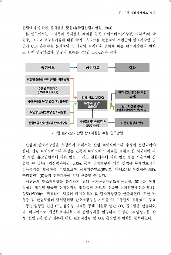 Ⅲ. 지역 생태계서비스 평가 77 산림에서 수확된 목제품을 뜻한다 국립산림과학원, 2014 본 연구에서는 고사목과 목제품을 제외한 입목 바이오매스 지상부, 지하부 와 낙 엽층, 그리고 토양유기물에 대한 국가고유자료를 활용하여 서천군의 탄소저장량 및 연간 CO2 흡수량을 분석하였고, 산림의 토지이용 변화에 따른 탄소저장량의 변화 도 함께 연구하였다. 연구의 흐름은 그림 Ⅲ-1-22 와 같다. 그림 Ⅲ-1-22 산림 탄소저장량 추정 연구방법 산림의 탄소저장량을 추정하기 위해서는 산림 바이오매스의 추정이 선행되어야 한다. 산림 바이오매스의 추정은 단목의 바이오매스 자료를 토대로 한 회귀식에 의 한 방법, 흉고단면적에 의한 방법, 그리고 전환계수에 의한 방법 등을 사용하여 산 출할 수 있다 국립산림과학원, 2006...