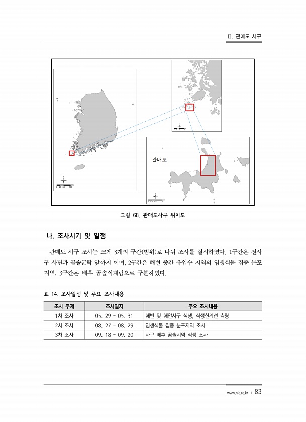 Ⅱ. 관매도 사구 www.nie.re.kr ? 83 그림 68. 관매도사구 위치도 나. 조사시기 및 일정 관매도 사구 조사는 크게 3개의 구간 범위 로 나눠 조사를 실시하였다. 1구간은 전사 구 사면과 곰솔군락 앞까지 이며, 2구간은 해변 중간 유입수 지역의 염생식물 집중 분포 지역, 3구간은 배후 곰솔식재림으로 구분하였다. 조사 주제 조사일자 주요 조사내용 1차 조사 05. 29 ? 05. 31 해빈 및 해안사구 식생, 식생한계선 측량 2차 조사 08. 27 ? 08. 29 염생식물 집중 분포지역 조사 3차 조사 09. 18 ? 09. 20 사구 배후 곰솔지역 식생 조사 표 14. 조사일정 및 주요조사내용
