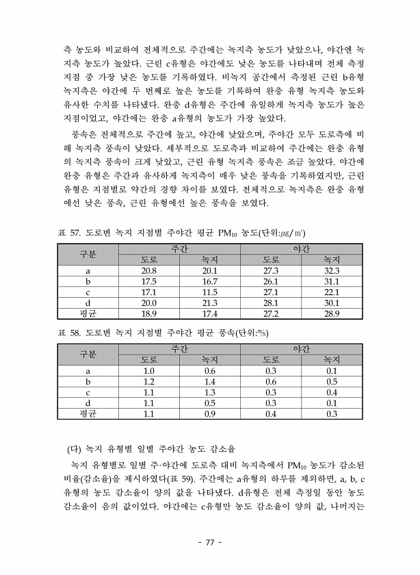 77 측 농도와 비교하여 전체적으로 주간에는 녹지측 농도가 낮았으나, 야간엔 녹 지측 농도가 높았다. 근린 c유형은 야간에도 낮은 농도를 나타내며 전체 측정 지점 중 가장 낮은 농도를 기록하였다. 비녹지 공간에서 측정된 근린 b유형 녹지측은 야간에 두 번째로 높은 농도를 기록하여 완충 유형 녹지측 농도와 유사한 수치를 나타냈다. 완충 d유형은 주간에 유일하게 녹지측 농도가 높은 지점이었고, 야간에는 완충 a유형의 농도가 가장 높았다. 풍속은 전체적으로 주간에 높고, 야간에 낮았으며, 주야간 모두 도로측에 비 해 녹지측 풍속이 낮았다. 세부적으로 도로측과 비교하여 주간에는 완충 유형 의 녹지측 풍속이 크게 낮았고, 근린 유형 녹지측 풍속은 조금 높았다. 야간에 완충 유형은 주간과 유사하게 녹지측이 매우 낮은 ...