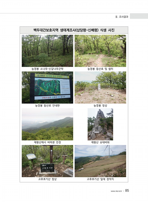 Ⅱ. 조사결과 www.nie.re.kr ? 85 백두대간보호지역 생태계조사 삽당령신배령 식생 사진 능경봉 소나무-신갈나무군락 능경봉 등산로 및 쉼터 능경봉 등산로 안내판 능경봉 정상 제왕산에서 바라본 전경 제왕산 솟대바위 고루포기산 정상 고루포기산 일대경작지