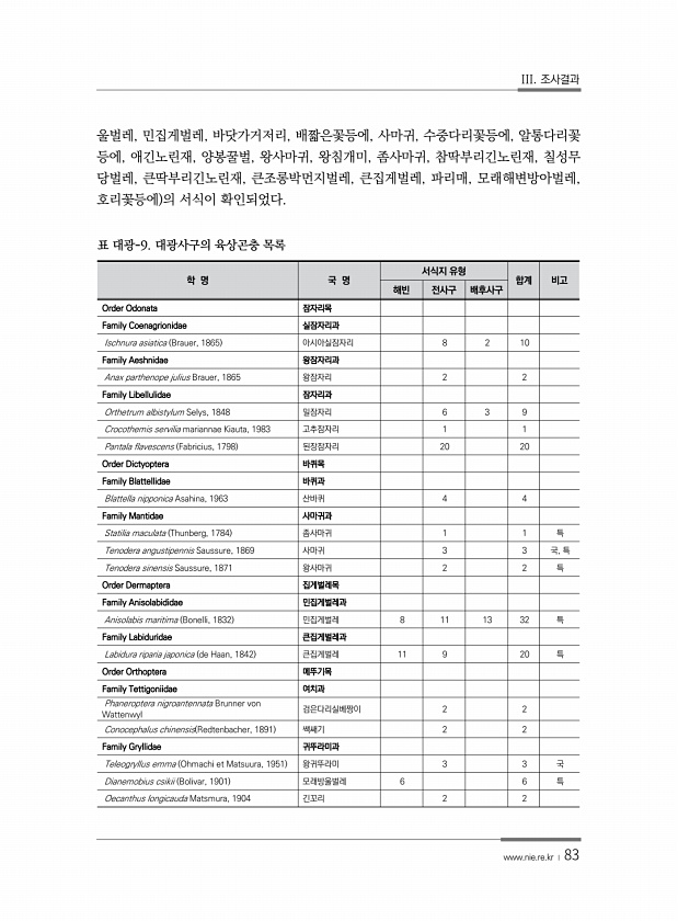 III. 조사결과 www.nie.re.kr ? 83 울벌레, 민집게벌레, 바닷가거저리, 배짧은꽃등에, 사마귀, 수중다리꽃등에, 알통다리꽃 등에, 애긴노린재, 양봉꿀벌, 왕사마귀, 왕침개미, 좀사마귀, 참딱부리긴노린재, 칠성무 당벌레, 큰딱부리긴노린재, 큰조롱박먼지벌레, 큰집게벌레, 파리매, 모래해변방아벌레, 호리꽃등에 의 서식이 확인되었다. 학 명 국 명 서식지 유형 합계 비고 해빈 전사구 배후사구 Order Odonata 잠자리목 Family Coenagrionidae 실잠자리과 Ischnura asiatica Brauer, 1865 아시아실잠자리 8 2 10 Family Aeshnidae 왕잠자리과 Anax parthenope julius Brauer, 1865 왕잠자리 2 2 Family Libellu...