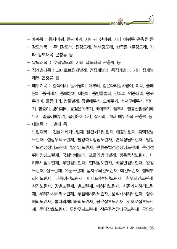 생태전문가와 함께하는 신나는 생태체험_ 95 바퀴목 왕사마귀, 좀사마귀, 사마귀, 산바퀴, 기타 바퀴목 곤충류 등 강도래목 무늬강도래, 진강도래, 녹색강도래, 한국큰그물강도래, 기 타 강도래목 곤충류 등 날도래목 우묵날도래, 기타 날도래목 곤충류 등 집게벌레목 고마로브집게벌레, 민집게벌레, 좀집게벌레, 기타 집게벌 레목 곤충류 등 메뚜기목 갈색여치, 실베짱이, 매부리, 검은다리실베짱이, 여치, 줄베 짱이, 좀쌕새기, 중베짱이, 배짱이, 좀방울벌레, 긴꼬리, 먹종다리, 왕귀 뚜라미, 풀종다리, 방울벌레, 좁쌀메뚜기, 모메뚜기, 섬서구메뚜기, 딱다 기, 팥중이, 방아깨비, 등검은메뚜기, 벼메뚜기, 풀무치, 팔공산밑들이메 뚜기, 밑들이메뚜기, 끝검은메뚜기, 삽사리, 기타 메뚜기목 곤충류 등 대벌목 대벌레 등 노린...
