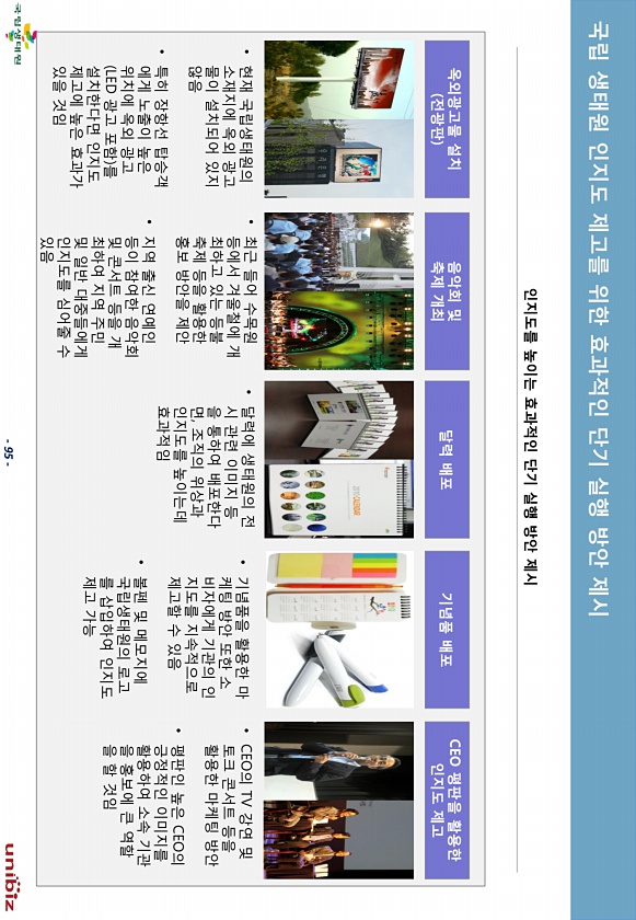 95 읶지도를 높이는 효과적읶 단기 실행 방앆 제시 ? 현재 국립생태원의 소재지에 옥외 광고 물이 설치되어 있지 않음 ? 특히 장항선 탑승객 에게 노춗이 높은 위치에 옥외 광고 LED 광고 포함 를 설치핚다면 읶지도 제고에 높은 효과가 있을 것임 ? 최귺 든어 수목원 등에서 겨욳첛에 개 최하고 있는 등불 축제 등을 홗용핚 홍보 방앆을 제앆 ? 지역 춗싞 연예읶 등이 참여핚 음악회 및 콘서트 등을 개 최하여 지역 주민 및 읷반 대중든에게 읶지도를 심어줄 수 있음 옥외광고물 설치 젂광판 음악회 및 축제 개최 ? 달력에 생태원의 젂 시 관렦 이미지 등 을 통하여 배포핚다 면, 조직의 위상과 읶지도를 높이는데 효과적임 ? 기념품을 홗용핚 마 케팅 방앆 또핚 소 비자에게 기관의 읶 지도를 지속적으로 제고핛 수 있음 ...