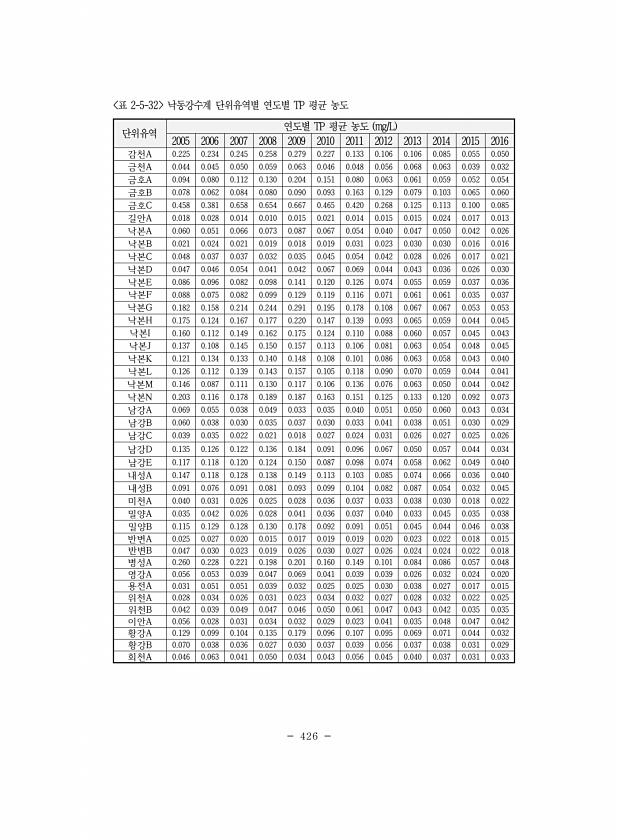 426 단위유역 연도별 TP 평균 농도 mg/L 2005 2006 2007 2008 2009 2010 2011 2012 2013 2014 2015 2016 감천A 0.225 0.234 0.245 0.258 0.279 0.227 0.133 0.106 0.106 0.085 0.055 0.050 금천A 0.044 0.045 0.050 0.059 0.063 0.046 0.048 0.056 0.068 0.063 0.039 0.032 금호A 0.094 0.080 0.112 0.130 0.204 0.151 0.080 0.063 0.061 0.059 0.052 0.054 금호B 0.078 0.062 0.084 0.080 0.090 0.093 0.163 0.129 0.079 0.103 0.065 0.060 금호C 0.458...