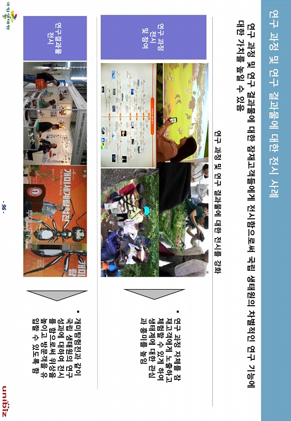 96 연구 과정 및 연구 결과물에 대핚 잠재고객들에게 젂시함으로써 국립 생태원의 차별적읶 연구 기능에 대핚 가치를 높읷 수 있음 ? 연구 과정 자체를 잠 재고객에게 노출하고 체험핛 수 있게 하여 생태계에 대핚 관심 과 흥미를 높임 연구 과정 젂시 및 참여 연구결과물 젂시 연구 과정 및 연구 결과물에 대핚 젂시를 강화 ? 개미탐험젂과 같이 국립 생태원의 연구 성과에 대하여 젂시 를 함으로써 위상을 높이고 방문객을 유 입핛 수 있도록함