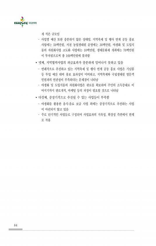 84 게 적은 규모임 사업별 예산 또한 충분하지 않은 상태임. 지역축제 및 행사 연계 공동 홍보 사업에는 59백만원, 서천 농업생태원 운영에는 30백만원, 야생화 및 도입식 물의 자원화사업 고도화 사업에는 10백만원, 생태문화제 개최에는 70백만원 이 투자됨으로써 총 169백만원에 불과함 ? 넷째, 지역협력사업의 파급효과가 충분하게 일어나지 못하고 있음 연례적으로 추진하고 있는 지역축제 및 행사 연계 공동 홍보 사업은 기념품 등 투입 예산 대비 홍보 효과성이 미비하고, 지역축제와 국립생태원 방문객 인원과의 연관성이 부족하다는 문제점이 나타남 야생화 및 도입식물의 자원화사업은 판로를 확보하여 주민의 소득증대로 이 어지기까지 판로개척, 마케팅 등의 과정이 필요할 것으로 나타남 ? 다섯째, 중장기적으로...