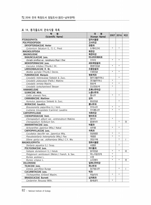2016 전국 특정도서 정밀조사 옹진-남부권역 82 ? National Institute of Ecology 학 명 Scientific Name 국 명 Korean Name 2007 2016 비고 PTERIDOPHYTA 양치식물문 POLYPODIOPSIDA 고사리강 DRYOPTERIDACEAE Herter 관중과 Cyrtomium falcatum L. f. C. Presl 도깨비고비 * * MAGNOLIOPSIDA 목련강 MAGNOLIIDAE 목련아강 RANUNCULACEAE Juss. 미나리아재비과 Clematis terniflora var. mandshurica Rupr. Ohwi 으아리 * * MENISPERMACEAE Juss. 새모래덩굴과 Cocculus trilobus Thunb. DC. 댕댕이덩...