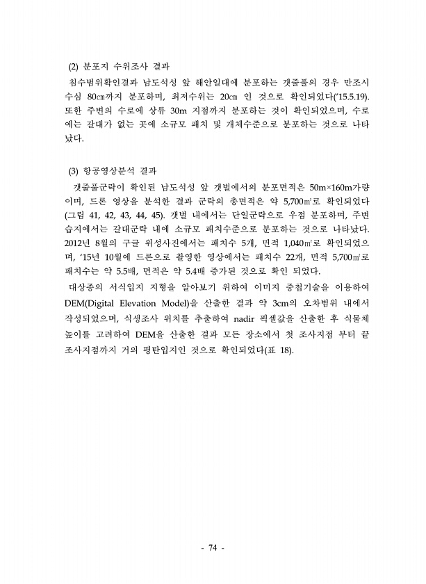 74 2 분포지 수위조사 결과 침수범위확인결과 남도석성 앞 해안일대에 분포하는 갯줄풀의 경우 만조시 수심 80㎝까지 분포하며, 최저수위는 20㎝ 인 것으로 확인되었다 ‘15.5.19 또한 주변의 수로에 상류 30m 지점까지 분포하는 것이 확인되었으며, 수로 에는 갈대가 없는 곳에 소규모 패치 및 개체수준으로 분포하는 것으로 나타 났다. 3 항공영상분석 결과 갯줄풀군락이 확인된 남도석성 앞 갯벌에서의 분포면적은 50m×160m가량 이며, 드론 영상을 분석한 결과 군락의 총면적은 약 5,700㎡로 확인되었다 그림 41, 42, 43, 44, 45 갯벌 내에서는 단일군락으로 우점 분포하며, 주변 습지에서는 갈대군락 내에 소규모 패치수준으로 분포하는 것으로 나타났다. 2012년 8월의 구글 위성사진에서는 패치수 5...