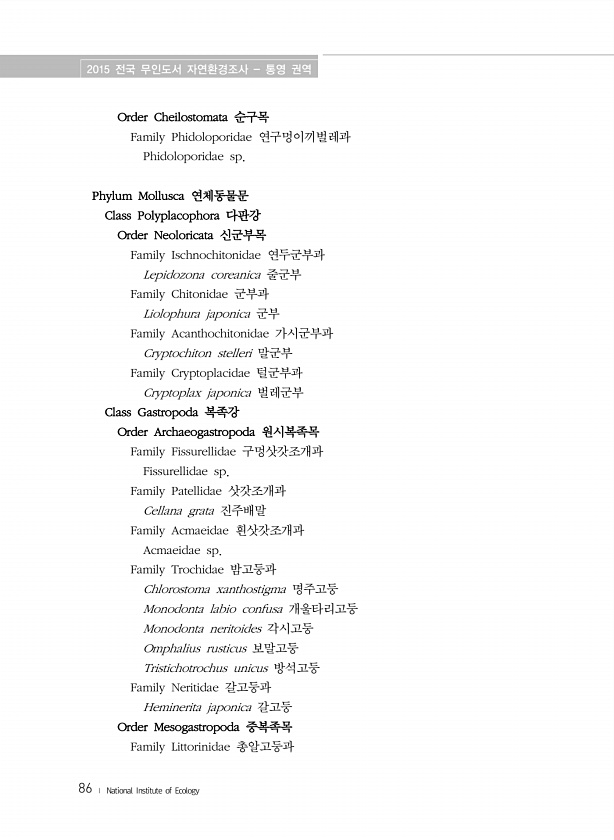 2015 전국 무인도서 자연환경조사 통영 권역 86 ? National Institute of Ecology Order Cheilostomata 순구목 Family Phidoloporidae 연구멍이끼벌레과 Phidoloporidae sp. Phylum Mollusca 연체동물문 Class Polyplacophora 다판강 Order Neoloricata 신군부목 Family Ischnochitonidae 연두군부과 Lepidozona coreanica 줄군부 Family Chitonidae 군부과 Liolophura japonica 군부 Family Acanthochitonidae 가시군부과 Cryptochiton stelleri 말군부 Family Cryptoplacidae 털군부과 Cryptoplax ...