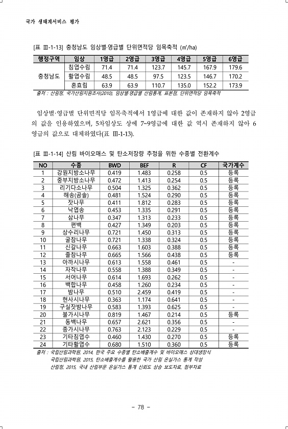 국가 생태계서비스 평가 78 행정구역 임상 1영급 2영급 3영급 4영급 5영급 6영급 충청남도 침엽수림 71.4 71.4 123.7 145.7 167.9 179.6 활엽수림 48.5 48.5 97.5 123.5 146.7 170.2 혼효림 63.9 63.9 110.7 135.0 152.2 173.9 출처 산림청, 국가산림지원조사 2010 , 임상별·영급별 산림통계, 표본점, 단위면적당 임목축적 [표 Ⅲ-1-13] 충청남도 임상별·영급별 단위면적당 임목축적 ㎥/ha 임상별·영급별 단위면적당 임목축적에서 1영급에 대한 값이 존재하지 않아 2영급 의 값을 인용하였으며, 5차임상도 상에 79영급에 대한 값 역시 존재하지 않아 6 영급의 값으로 대체하였다 표 Ⅲ-1-13 NO 수종 BWD BEF R CF 국가계수 1...