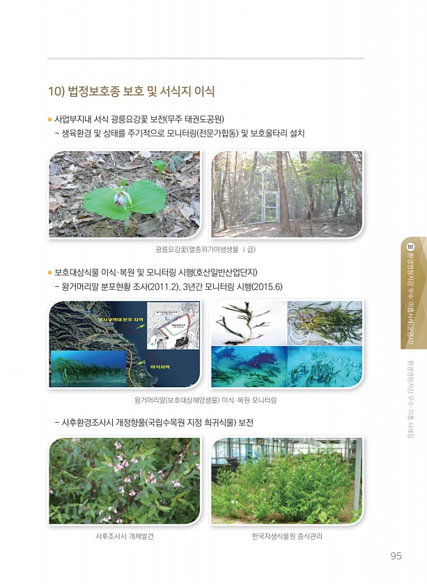 환경영향저감 우수·미흡 사례집 환경영향저감 우수·미흡사례 운영시 Ⅲ 95 10 법정보호종 보호 및 서식지 이식 ● 사업부지내 서식 광릉요강꽃 보전 무주 태권도공원 생육환경 및 상태를 주기적으로 모니터링 전문가합동 및 보호울타리 설치 ● 보호대상식물 이식·복원 및 모니터링 시행 호산일반산업단지 왕거머리말 분포현황 조사 2011.2 , 3년간 모니터링 시행 2015.6 사후환경조사시 개정향풀 국립수목원 지정 희귀식물 보전 광릉요강꽃 멸종위기야생생물 Ⅰ급 왕거머리말 보호대상해양생물 이식·복원 모니터링 사후조사시 개체발견 한국자생식물원증식관리