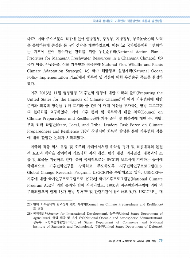 국내외 생태분야 기후변화 적응방안의 흐름과 발전방향 제2장 관련 국제협약 및 국내외 정책 현황 79 다27 미국 주요부문의 적응에 있어 연방정부, 주정부, 지방정부, 부족 tribe 의 노력 을 통합하는데 중점을 둔 3개 전략을 개발하였으며, 이는 a 국가행동계획 변화하 는 기후에 있어 담수자원 관리를 위한 우선순위화 National Action Plan Priorities for Managing Freshwater Resources in a Changing Climate , b 국가 어류, 야생동물, 식물 기후변화 적응전략 National Fish, Wildlife and Plants Climate Adaptation Strategy , c 국가 해양정책 실행계획 National Ocean Policy I...