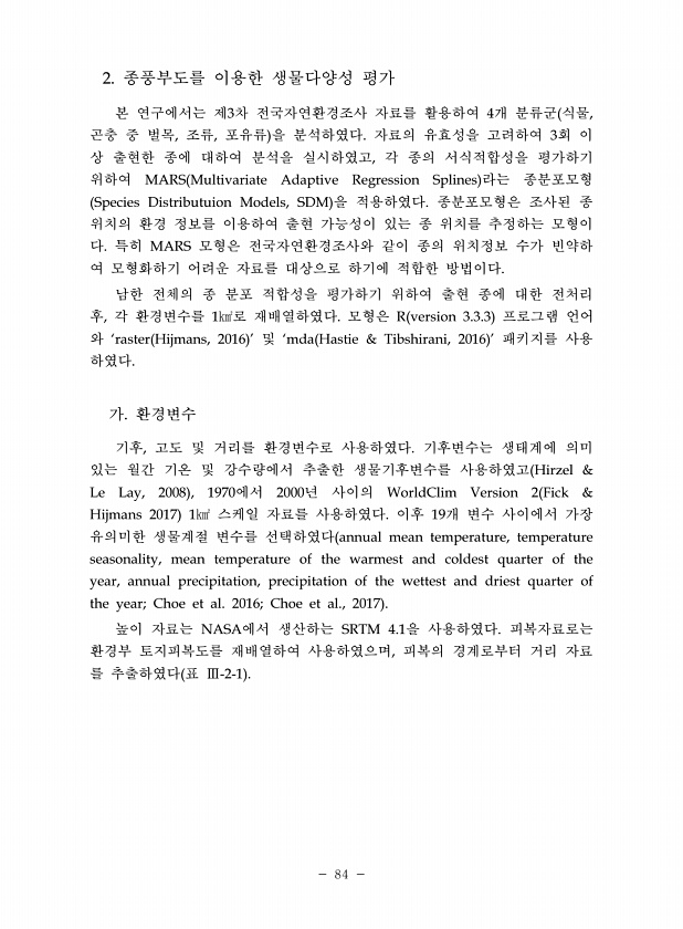 84 2. 종풍부도를 이용한 생물다양성 평가 본 연구에서는 제3차 전국자연환경조사 자료를 활용하여 4개 분류군 식물, 곤충 중 벌목, 조류, 포유류 을 분석하였다. 자료의 유효성을 고려하여 3회 이 상 출현한 종에 대하여 분석을 실시하였고, 각 종의 서식적합성을 평가하기 위하여 MARS Multivariate Adaptive Regression Splines 라는 종분포모형 Species Distributuion Models, SDM 을 적용하였다. 종분포모형은 조사된 종 위치의 환경 정보를 이용하여 출현 가능성이 있는 종 위치를 추정하는 모형이 다. 특히 MARS 모형은 전국자연환경조사와 같이 종의 위치정보 수가 빈약하 여 모형화하기 어려운 자료를 대상으로 하기에 적합한 방법이다. 남한 전체의 종 분포 적...