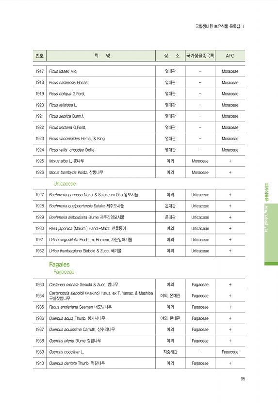 95 번호 학 명 장 소 국가생물종목록 APG 피자식물문 Magnoliophyta 국립생태원 보유식물 목록집 Ⅰ 1917 Ficus fraseri Miq. 열대관 Moraceae 1918 Ficus natalensis Hochst. 열대관 Moraceae 1919 Ficus obliqua G.Forst. 열대관 Moraceae 1920 Ficus religiosa L. 열대관 Moraceae 1921 Ficus septica Burm.f. 열대관 Moraceae 1922 Ficus tinctoria G.Forst. 열대관 Moraceae 1923 Ficus vaccinioides Hemsl. & King 열대관 Moraceae 1924 Ficus vallis-choudae Delile 열대관 Moraceae...