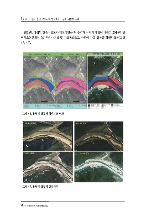 2018 생태·경관 우수지역 발굴조사 경북 내성천 일대 86 ? National Institute of Ecology 2018년 작성된 현존식생도와 비교하였을 때 수역과 나지의 패턴이 바뀌고 2015년 일 년생초본군집이 2018년 다년생 및 아교목층으로 바뀌어 가고 있음을 확인하였음 그림 46, 47 그림 46. 용혈리 상류의 식생분포 변화 그림 47. 용혈리 상류의항공사진