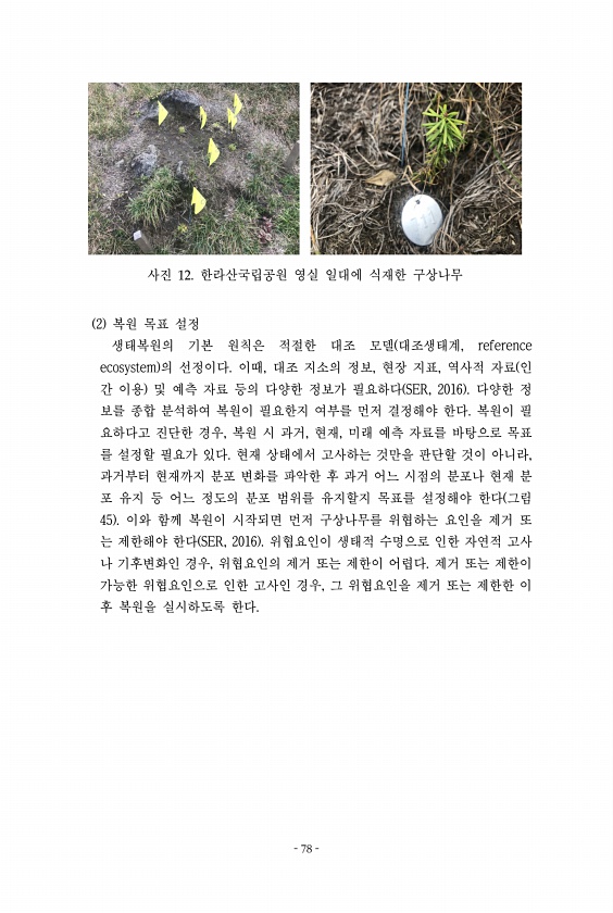 사진 한라산국립공원 영실 일대에 식재한 구상나무 2 복원 목표 설정 생태복원의 기본 원칙은 적절한 대조 모델 대조생태계, reference ecosystem 의 선정이다. 이때, 대조 지소의 정보, 현장 지표, 역사적 자료 인 간 이용 및 예측 자료 등의 다양한 정보가 필요하다 SER, 2016 다양한 정 보를 종합 분석하여 복원이 필요한지 여부를 먼저 결정해야 한다. 복원이 필 요하다고 진단한 경우, 복원 시 과거, 현재, 미래 예측 자료를 바탕으로 목표 를 설정할 필요가 있다. 현재 상태에서 고사하는 것만을 판단할 것이 아니라, 과거부터 현재까지 분포 변화를 파악한 후 과거 어느 시점의 분포나 현재 분 포 유지 등 어느 정도의 분포 범위를 유지할지 목표를 설정해야 한다 그림 45 이와 함께 복원이 시작되...