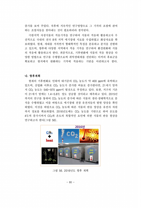 80 증가를 보여 주었다. 차후에 지속적인 연구방향으로 그 기작의 조절에 관여 하는 조절자들을 찾아내는 것이 필요하리라 생각된다. 극한지역 자생식물의 적응기작을 연구하여 식물의 적응에 활용하고자 우 선적으로 국내의 전국 8개 지역 애기장대 시료를 수집하였고 화상자료를 확 보하였다. 현재, 세대를 거치면서 형태학적인 특징을 분류하고 분석을 진행하 고 있으며, 향후에 다양한 지역에서 적응 기작을 연구하여 환경변화에 식물 의 적응에 활용하고자 한다. 최종적으로, 기후변화에 식물의 적응 현상을 다 양한 방법으로 연구를 수행함으로써 취약생태계를 진단하는 마커의 후보군을 확보하고 현지에서 완화하는 기작에 적용하는 기반을 마련하고자 한다. 나. 향후계획 현재의 기후변화로 인하여 대기중의 CO2 농도가 약 400 ppm에...