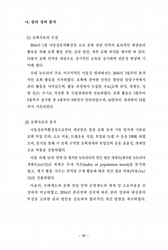 나. 관리 성과 분석 1 포획자료의 수집 2016년 1월 낙동강유역환경청 소속 포획 전담 인력의 효과적인 현장관리 활동을 위해 포획 활동 전략, 실천 방안, 세부 포획 위치를 제시한 바 있다. 더불어 포획 인력을 대상으로 정기적인 교육을 실시하며 전문성 향상에 기 여해 왔다. 국내 뉴트리아 주요 서식지역인 낙동강 일대에서는 2016년 3월부터 본격 적인 포획 활동을 시작하였다. 포획에 참여한 인력은 할당된 담당구역에서 관리 활동을 이어갔으며, 활동 과정에서 수집된 자료 포획 위치, 개체수, 성 별 등 는 수기로 작성한 후 국립생태원에 전송하였다. 포획 활동은 3월부터 5월까지 실시한 후 6월부터 9월까지 중단되었으며, 10월부터 재개하여 12월 까지 지속되었다. 2 포획자료의 분석 낙동강유역환경청으로부터 제...