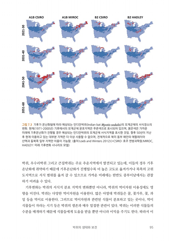 박쥐의 생태와 보전 95 박쥐, 우수리박쥐 그리고 큰집박쥐는 주로 추운지역에서 발견되고 있는데, 이들의 경우 기후 온난화에 취약하기 때문에 기후온난화가 진행될수록 더 높은 고도로 옮겨가거나 북쪽의 고위 도지역으로 서식 범위를 옮겨 갈 수 있으므로 가까운 미래에는 한반도 중부이남에서는 관찰 하기 어려울 수 있다. 기후변화는 박쥐의 서식지 분포 지역의 변화뿐만 아니라, 박쥐의 먹이자원 이용성에도 영 향을 미친다. 박쥐는 다양한 먹이자원을 이용한다. 많은 아열대 박쥐들은 꿀, 꽃가루, 꽃, 과 일 등을 먹이로 이용한다. 그러므로 먹이자원과 관련된 식물이 분포하고 있는 곳이나, 먹이 식물들이 자라는 시기 등은 박쥐의 생존과 매우 밀접한 관련이 있다. 박쥐는 이러한 식물들의 수분을 매개하기 때문에 식물들에게 도움을 ...