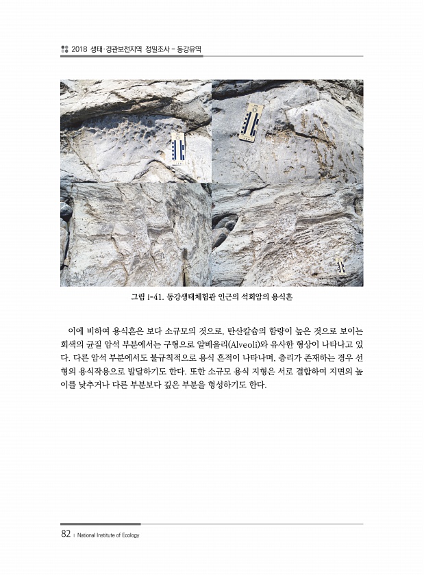 2018 생태·경관보전지역 정밀조사 동강유역 82 ? National Institute of Ecology 그림 i-41. 동강생태체험관 인근의 석회암의 용식흔 이에 비하여 용식흔은 보다 소규모의 것으로, 탄산칼슘의 함량이 높은 것으로 보이는 회색의 균질 암석 부분에서는 구형으로 알베올리 Alveoli 와 유사한 형상이 나타나고 있 다. 다른 암석 부분에서도 불규칙적으로 용식 흔적이 나타나며, 층리가 존재하는 경우 선 형의 용식작용으로 발달하기도 한다. 또한 소규모 용식 지형은 서로 결합하여 지면의 높 이를 낮추거나 다른 부분보다 깊은 부분을 형성하기도한다.