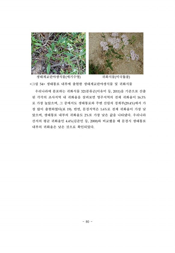 80 생태계교란야생식물 애기수영 귀화식물 미국톱풀 그림 54 생태통로 내부에 출현한 생태계교란야생식물 및 귀화식물 우리나라에 분포하는 귀화식물 321분류군 이유미 등, 2011 을 기준으로 산출 된 각각의 조사지역 내 귀화율을 살펴보면 영주지역의 전체 귀화율이 16.3% 로 가장 높았으며, 그 중에서도 생태통로와 주변 산림의 경계부 29.4% 에서 가 장 많이 출현하였다 표 19 반면, 문경지역은 1.6%로 전체 귀화율이 가장 낮 았으며, 생태통로 내부의 귀화율도 2%로 가장 낮은 값을 나타냈다. 우리나라 산지의 평균 귀화율인 4.4% 김준민 등, 2000 와 비교했을 때 문경시 생태통로 내부의 귀화율은 낮은 것으로확인되었다.