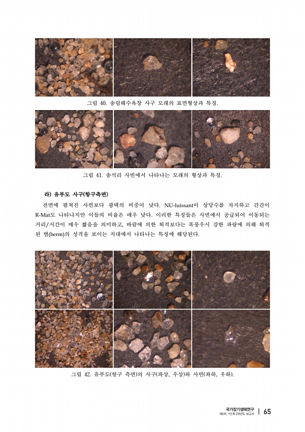 그림 40. 송림해수욕장 사구 모래의 표면형상과 특징. 그림 41. 송석리 사빈에서 나타나는 모래의 형상과 특징. 라 유부도 사구 항구측면 전면에 펼쳐진 사빈보다 광택의 비중이 낮다 이 상당수를 차지하고 간간이 도 나타나지만 이들의 비율은 매우 낮다 이러한 특징들은 사빈에서 공급되어 이동되는 거리 시간이 매우 짧음을 의미하고 바람에 의한 퇴적보다는 폭풍우시 강한 파랑에 의해 퇴적 된 범 의 성격을 보이는 지대에서 나타나는 특징에 해당된다 그림 42. 유부도 항구 측면 의 사구 좌상, 우상 와 사빈 좌하, 우하 국가장기생태연구 제2차, 1단계 2차년도 보고서 |65