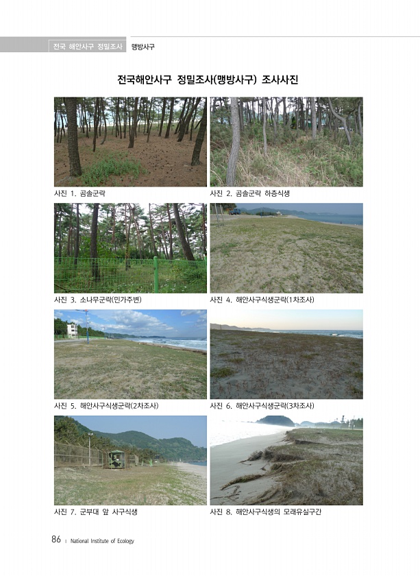 전국 해안사구 정밀조사 맹방사구 86 ? National Institute of Ecology 전국해안사구 정밀조사 맹방사구 조사사진 사진 1. 곰솔군락 사진 2. 곰솔군락 하층식생 사진 3. 소나무군락 민가주변 사진 4. 해안사구식생군락 1차조사 사진 5. 해안사구식생군락 2차조사 사진 6. 해안사구식생군락 3차조사 사진 7. 군부대 앞 사구식생 사진 8. 해안사구식생의모래유실구간