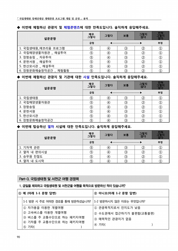 ?국립생태원 장애인대상 생태관광 프로그램 개발 및 운영? 용역 90 ◆ 이번에 체험하신 관광지 및 체험콘텐츠에 대한 만족도입니다. 솔직하게 응답해주세요. 설문문항 매우 그렇다 그렇다 보통 그렇지 않다 그렇지 전혀 않다 긍정 ◀----------------------------▶ 부정 1. 국립생태원_에코리움 프로그램 ⑤ ④ ③ ② ① 2. 국립해양생물자원관 _ 해설투어 ⑤ ④ ③ ② ① 3. 장항송림 _ 자유투어 ⑤ ④ ③ ② ① 4. 문헌서원 _ 해설투어 ⑤ ④ ③ ② ① 5. 한산모시관 _ 해설투어 ⑤ ④ ③ ② ① 6. 장항문화예술창작공간 _ 체험활동 ⑤ ④ ③ ② ① ◆ 이번에 체험하신 관광지 및 기관에 대한 시설 만족도입니다. 솔직하게 응답해주세요. 설문문항 매우 그렇다 그렇다 보통 그렇지 않다 그...