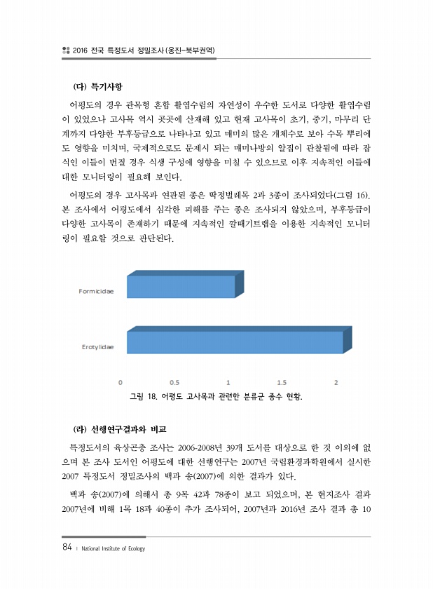 2016 전국 특정도서 정밀조사 옹진-북부권역 84 ? National Institute of Ecology 다 특기사항 어평도의 경우 관목형 혼합 활엽수림의 자연성이 우수한 도서로 다양한 활엽수림 이 있었으나 고사목 역시 곳곳에 산재해 있고 현재 고사목이 초기, 중기, 마무리 단 계까지 다양한 부후등급으로 나타나고 있고 매미의 많은 개체수로 보아 수목 뿌리에 도 영향을 미치며, 국제적으로도 문제시 되는 매미나방의 알집이 관찰됨에 따라 잡 식인 이들이 번질 경우 식생 구성에 영향을 미칠 수 있으므로 이후 지속적인 이들에 대한 모니터링이 필요해 보인다. 어평도의 경우 고사목과 연관된 종은 딱정벌레목 2과 3종이 조사되었다 그림 16 본 조사에서 어평도에서 심각한 피해를 주는 종은 조사되지 않았으며, 부후등급이...