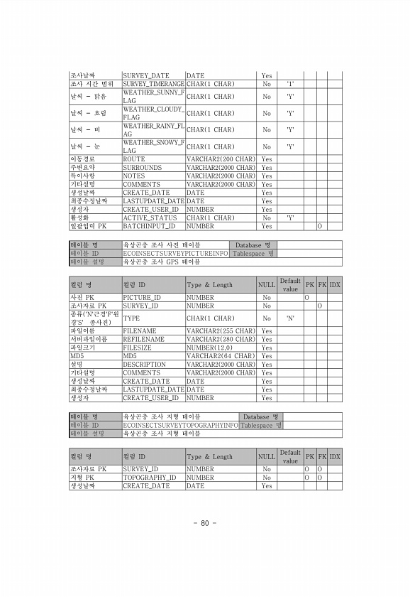 80 조사날짜 SURVEY_DATE DATE Yes 조사 시간 범위 SURVEY_TIMERANGE CHAR 1 CHAR No 1날씨 맑음 WEATHER_SUNNY_F LAG CHAR 1 CHAR No Y날씨 흐림 WEATHER_CLOUDY_ FLAG CHAR 1 CHAR No Y날씨 비 WEATHER_RAINY_FL AG CHAR 1 CHAR No Y날씨 눈 WEATHER_SNOWY_F LAG CHAR 1 CHAR No Y이동경로 ROUTE VARCHAR2 200 CHAR Yes 주변요약 SURROUNDS VARCHAR2 2000 CHAR Yes 특이사항 NOTES VARCHAR2 2000 CHAR Yes 기타설명 COMMENTS VARCHAR2 2000 CHAR Yes 생성날짜 CREATE_DATE DAT...