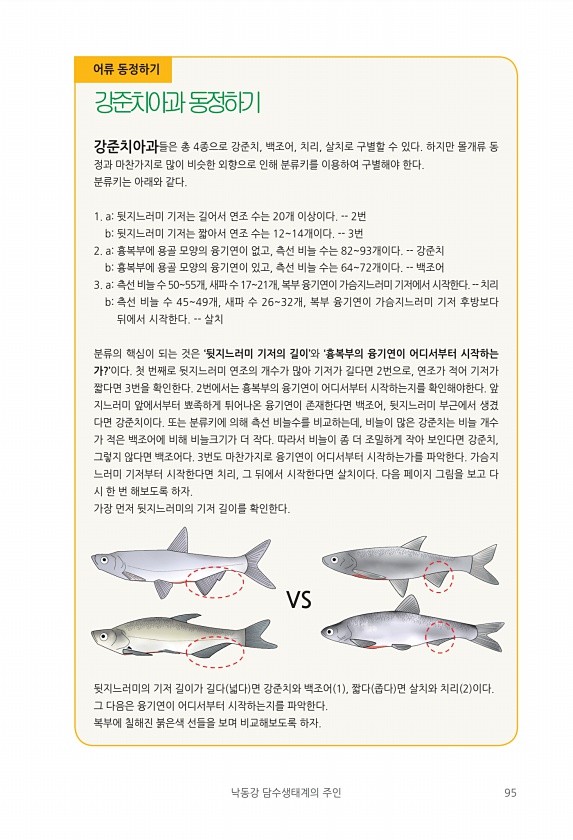 낙동강 담수생태계의 주인 95 강준치아과들은 총 4종으로 강준치, 백조어, 치리, 살치로 구별할 수 있다. 하지만 몰개류 동 정과 마찬가지로 많이 비슷한 외향으로 인해 분류키를 이용하여 구별해야 한다. 분류키는 아래와 같다. 1. a뒷지느러미 기저는 길어서 연조 수는 20개 이상이다. -- 2번 b뒷지느러미 기저는 짧아서 연조 수는 1214개이다. -- 3번 2. a흉복부에 용골 모양의 융기연이 없고, 측선 비늘 수는 8293개이다. -- 강준치 b흉복부에 용골 모양의 융기연이 있고, 측선 비늘 수는 6472개이다. -- 백조어 3. a측선 비늘 수 5055개, 새파 수 1721개, 복부 융기연이 가슴지느러미 기저에서 시작한다. -- 치리 b측선 비늘 수 4549개, 새파 수 2632개, 복부 융기연이 가슴...
