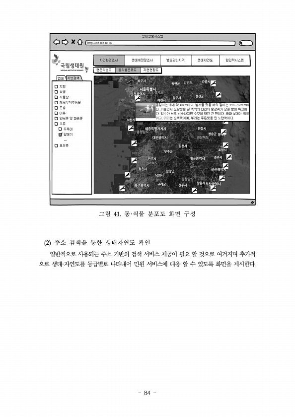 그림 41. 동·식물 분포도 화면 구성 2 주소 검색을 통한 생태자연도 확인 일반적으로 사용되는 주소 기반의 검색 서비스 제공이 필요 할 것으로 여겨지며 추가적 으로 생태·자연도를 등급별로 나타내어 민원 서비스에 대응 할 수 있도록 화면을제시한다.