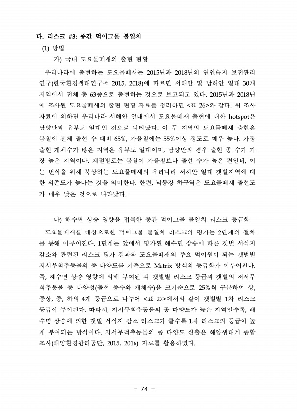 74 다. 리스크 #3종간 먹이그물 불일치 1 방법 가 국내 도요물떼새의 출현 현황 우리나라에 출현하는 도요물떼새는 2015년과 2018년의 연안습지 보전관리 연구 한국환경생태연구소 2015, 2018 에 따르면 서해안 및 남해안 일대 30개 지역에서 전체 총 63종으로 출현하는 것으로 보고되고 있다. 2015년과 2018년 에 조사된 도요물떼새의 출현 현황 자료를 정리하면 표 26 와 같다. 위 조사 자료에 의하면 우리나라 서해안 일대에서 도요물떼새 출현에 대한 hotspot은 남양만과 유부도 일대인 것으로 나타났다. 이 두 지역의 도요물떼새 출현은 봄철에 전체 출현 수 대비 65%, 가을철에는 55%이상 정도로 매우 높다. 가장 출현 개체수가 많은 지역은 유부도 일대이며, 남양만의 경우 출현 종 수가 가...