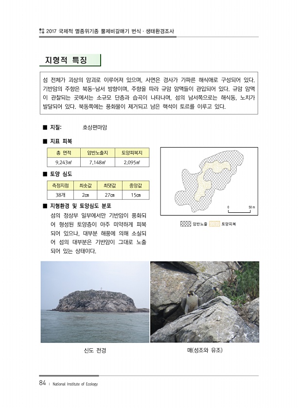 2017 국제적 멸종위기종 뿔제비갈매기 번식·생태환경조사 84 ? National Institute of Ecology 지형적 특징 섬 전체가 괴상의 암괴로 이루어져 있으며, 사면은 경사가 가파른 해식애로 구성되어 있다. 기반암의 주향은 북동-남서 방향이며, 주향을 따라 규암 암맥들이 관입되어 있다. 규암 암맥 이 관찰되는 곳에서는 소규모 단층과 습곡이 나타나며, 섬의 남서쪽으로는 해식동, 노치가 발달되어 있다. 북동쪽에는 풍화물이 제거되고 남은 핵석이 토르를 이루고 있다. ■ 지질호상편마암 ■ 지표 피복 총 면적 암반노출지 토양피복지 9,243㎡ 7,148㎡ 2,095㎡ ■ 토양 심도 측정지점 최솟값 최댓값 중앙값 38개 2㎝ 27㎝ 15㎝ ■ 지형환경 및 토양심도 분포 섬의 정상부 일부에서만 기반암이 풍...