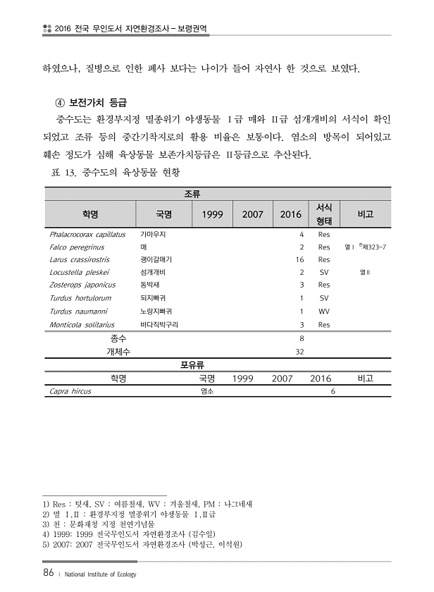 2016 전국 무인도서 자연환경조사 보령권역 86 ? National Institute of Ecology 하였으나, 질병으로 인한 폐사 보다는 나이가 들어 자연사 한 것으로 보였다. ④ 보전가치 등급 중수도는 환경부지정 멸종위기 야생동물 Ⅰ급 매와 Ⅱ급 섬개개비의 서식이 확인 되었고 조류 등의 중간기착지로의 활용 비율은 보통이다. 염소의 방목이 되어있고 훼손 정도가 심해 육상동물 보존가치등급은 Ⅱ등급으로 추산된다. 표 13. 중수도의 육상동물 현황 조류 학명 국명 1999 2007 2016 서식 형태 비고 Phalacrocorax capillatus 가마우지 4 Res Falco peregrinus 매 2 Res 멸Ⅰ 천 제323-7 Larus crassirostris 괭이갈매기 16 Res Locuste...